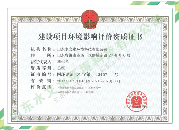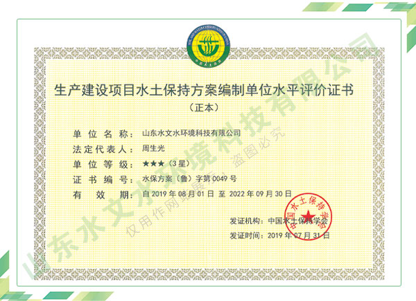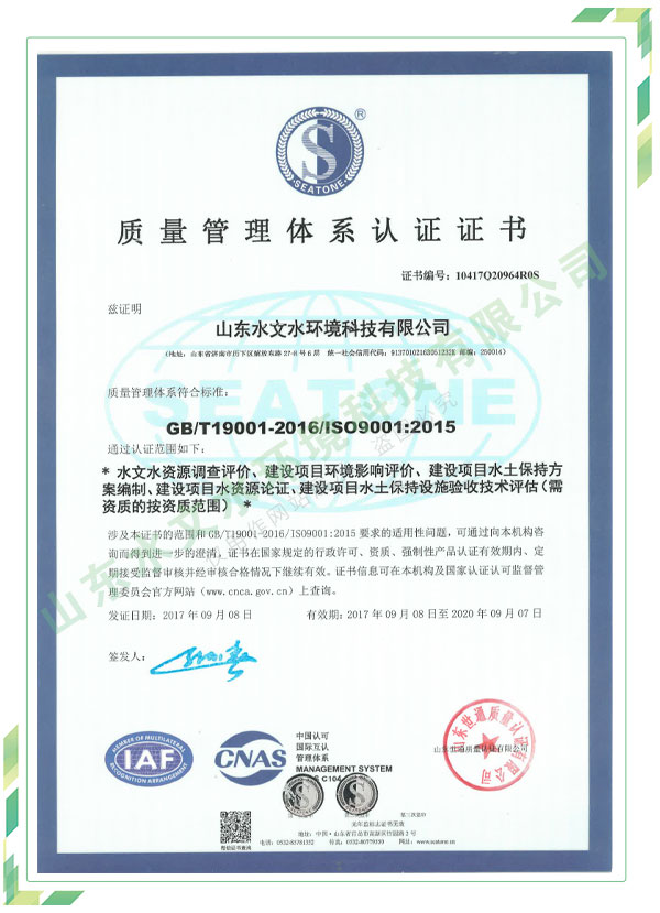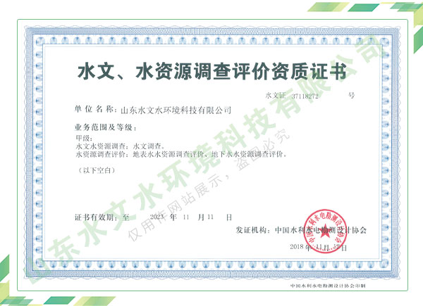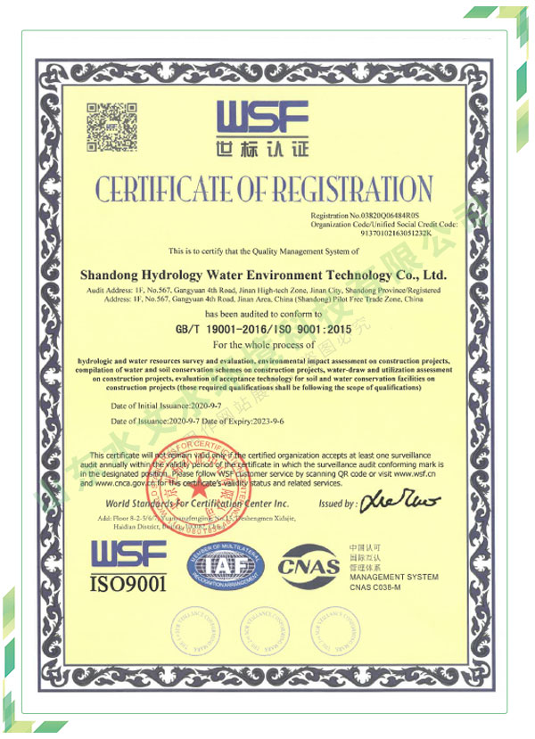 公司擁有水利工程設(shè)計(jì)、水土保持、水文水資源調(diào)查評(píng)價(jià)、水資源論證、建設(shè)項(xiàng)目環(huán)境影響評(píng)價(jià)、市政公用工程施工總承包、水利水電工程施工總承包、電子與智能化工程專(zhuān)業(yè)承包等資質(zhì),2017年通過(guò)質(zhì)量管理體系、環(huán)境管理體系、職業(yè)健康安全管理體系認(rèn)證;2020年被評(píng)為國(guó)家級(jí)高新技術(shù)企業(yè),同年被中國(guó)水利企業(yè)協(xié)會(huì)推薦為第一批“合同節(jié)水服務(wù)企業(yè)”;2021年被山東省、濟(jì)南市評(píng)為 “專(zhuān)精特新”中小企業(yè)。業(yè)務(wù)范圍涉及水利工程設(shè)計(jì);節(jié)水設(shè)計(jì)、改造、水平衡測(cè)試;山洪災(zāi)害調(diào)查;城市水資源調(diào)查評(píng)價(jià);建設(shè)項(xiàng)目水土保持方案編制、監(jiān)測(cè)、驗(yàn)收、水土保持規(guī)劃;水安全保障規(guī)劃、建設(shè)項(xiàng)目水資源論證、規(guī)劃水資源論證;建設(shè)項(xiàng)目環(huán)境影響評(píng)價(jià);入河排污口論證;防洪影響評(píng)價(jià);市政公用工程施工、水利水電工程施工、電子與智能化工程施工等。